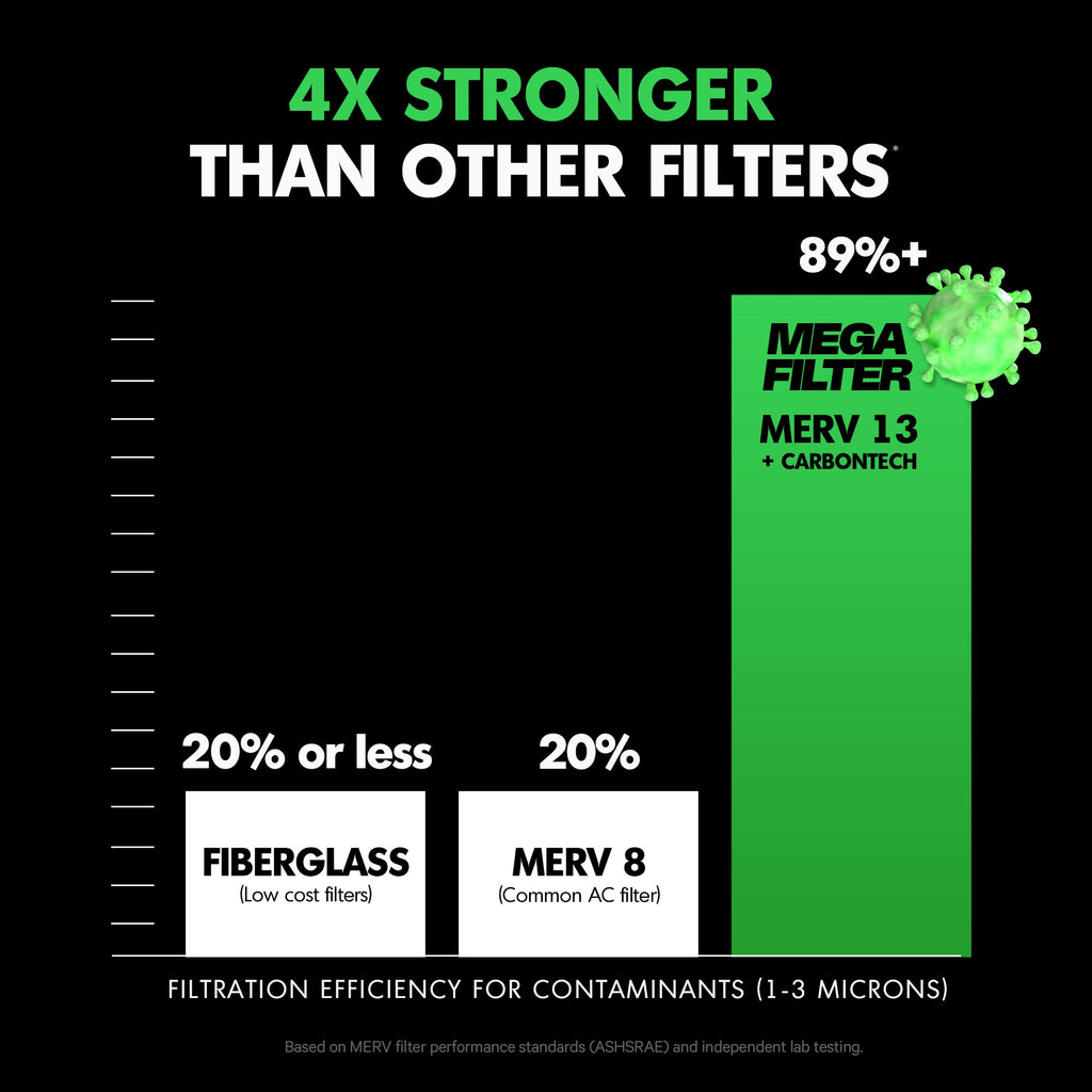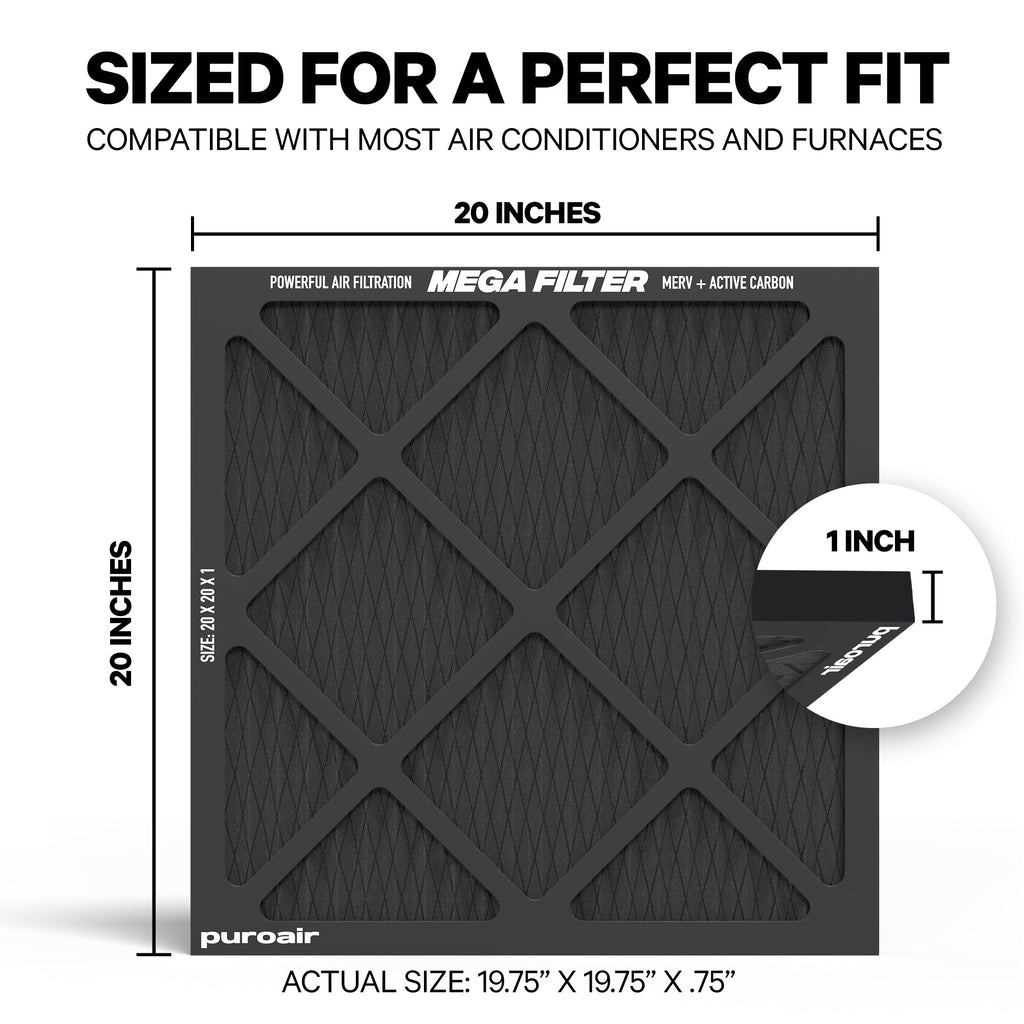 Say goodbye to allergies and hello to clean air with the revolutionary PuroAir HVAC Mega Air Filter! Our high-performance carbon-activated filter is the ultimate solution for improving air quality in both residential and commercial HVAC systems. By harnessing the power of activated carbon, these MERV 13 filters reduce a wide range of pollutants that traditional fiberglass HVAC filters can't capture, including allergens, harmful gases, odors, volatile organic compounds (VOCs), and other airborne particles.* The cutting-edge technology behind carbon filtration ensures a cleaner, fresher, and healthier indoor environment, making it the perfect choice for any space where air quality matters.